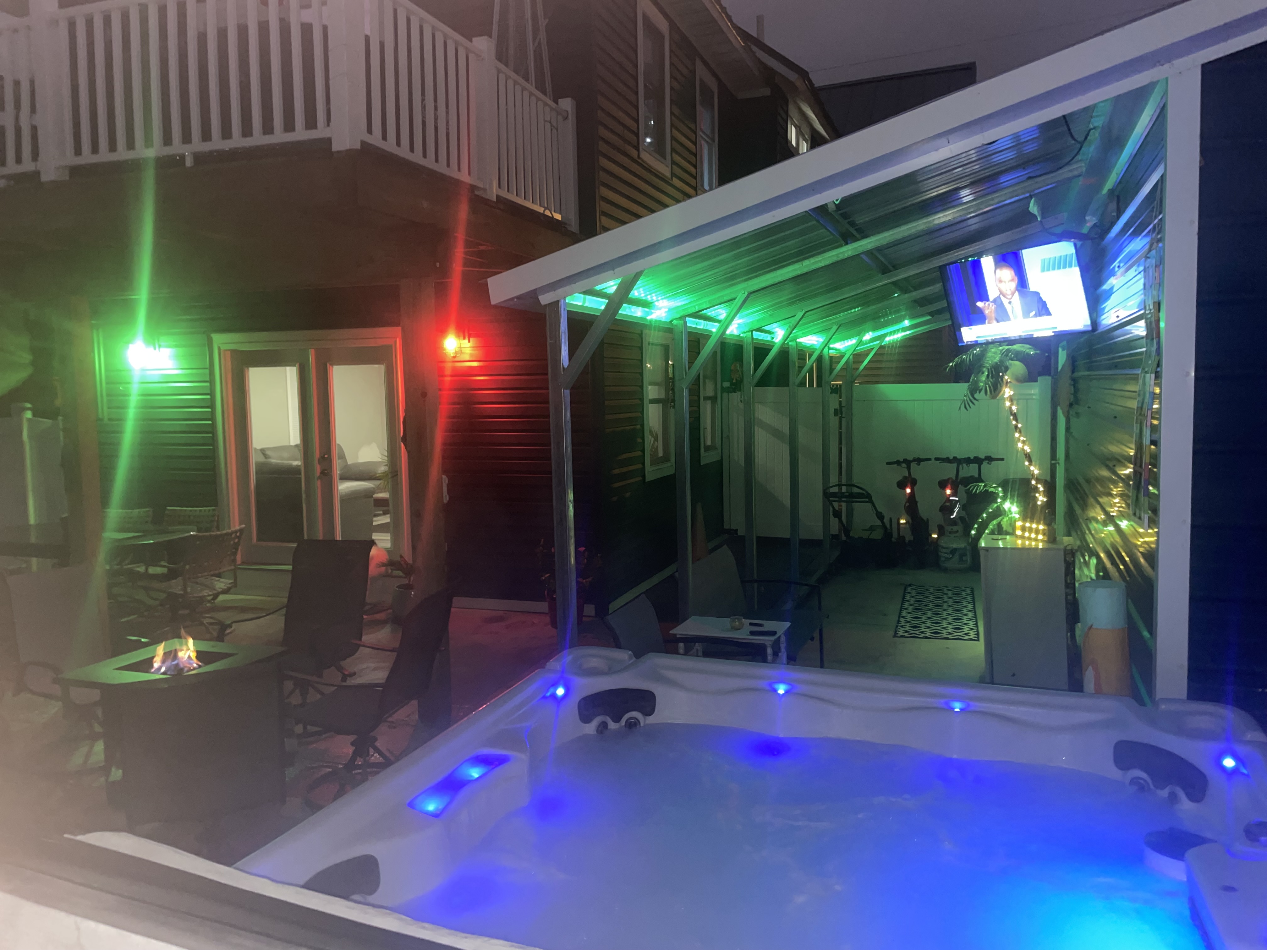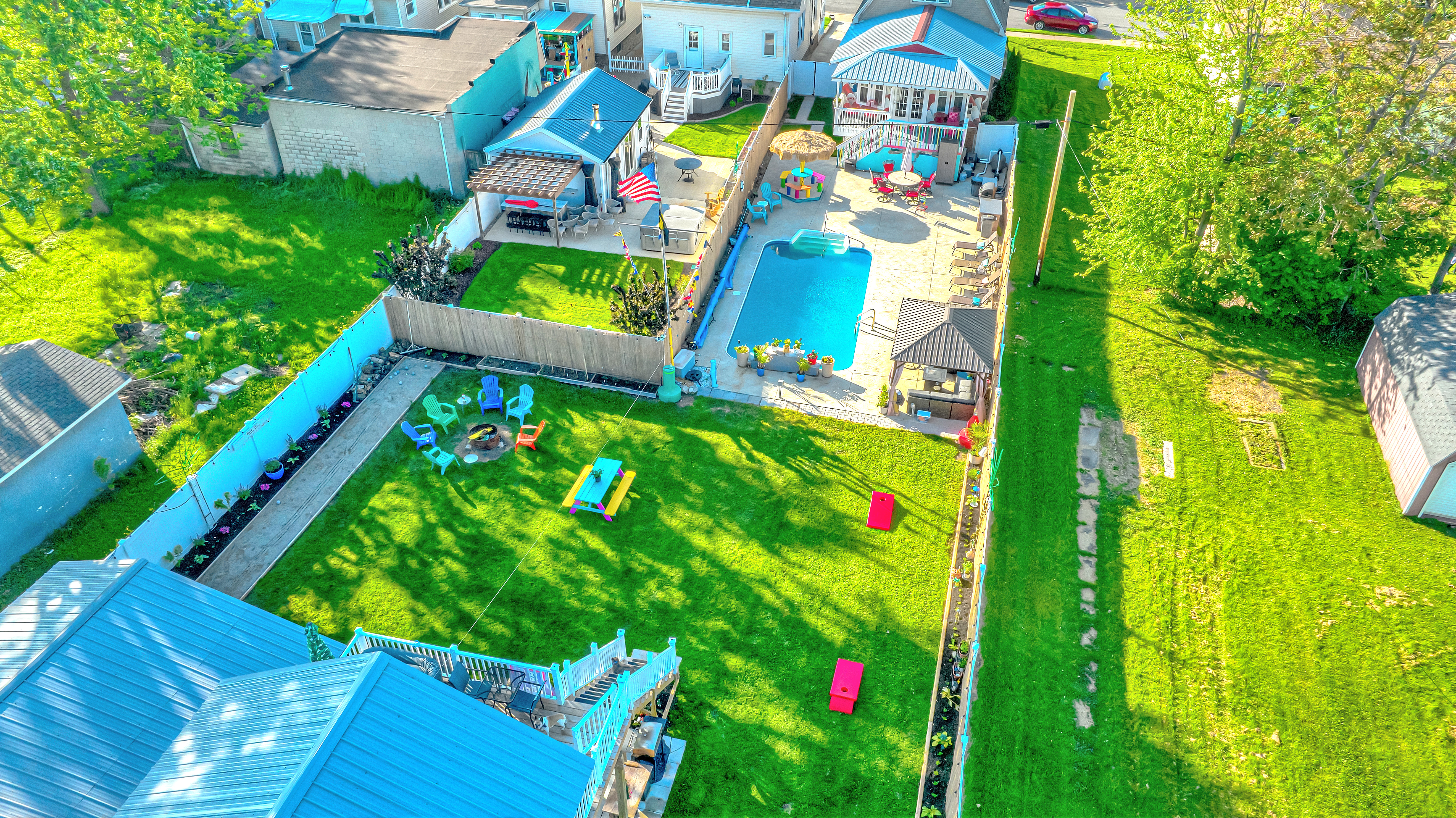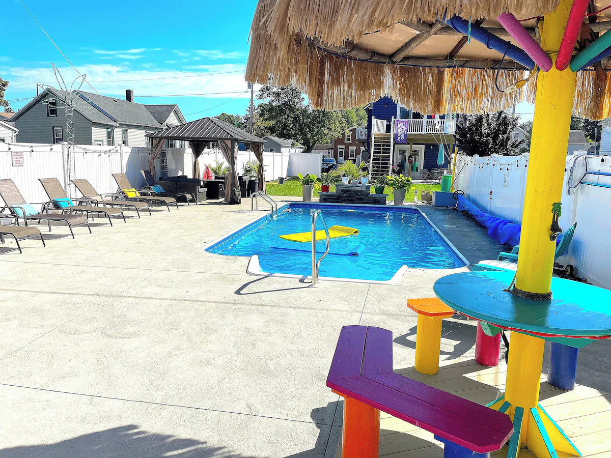 Our "Mini-resort" is a great spot for your ultimate enjoyment for a Cedar Point Vacation Rental! Relax in our 14 x 28, 4 ft. deep inground, heated, saltwater pool with waterfall! We have a unique set up as we own through to 2 streets back to back so we have adjoining back yards for double enjoyment! Not only do you have the amazing pool deck with heated, in ground pool but a nice grassy area with cornhole, Bocce ball, fire pit or anything else you wish to do back there.