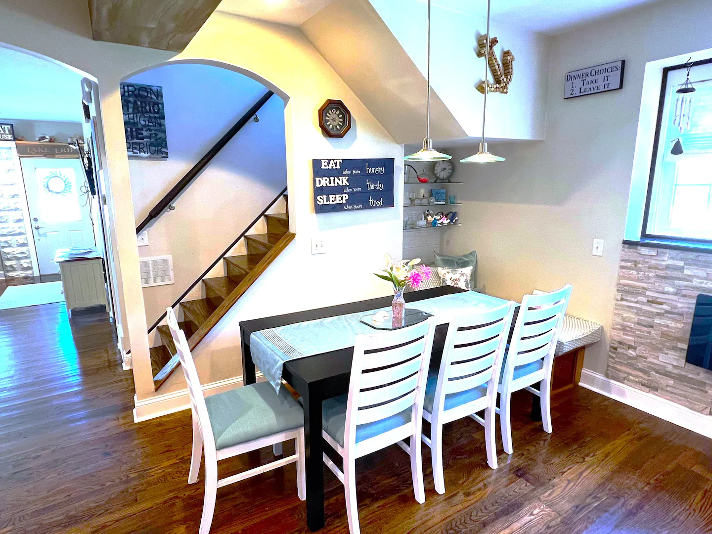 With a duplicate of the famous Round House Bar on Put In Bay, this is a unique & fun feature of this home. 1,800 sq. ft, 3 bedroom, 2 bath home with multiple gathering spaces. Downstairs features a nice sized living area with kitchen and dining area, all hardwood flooring. The kitchen features granite with double oven / microwave / convection oven, instant hot water, dishwasher too. The dining area has a bar area with another sink and icemaker that makes up to 30 pounds of ice per day. The downstairs has a washer & dryer and huge walk in shower. Even a bidet on the toilet. To the rear, overlooking the pool is our version of the "Round House Bar". A complete duplicate with our own Whiskey light, another frig, popcorn machine and 6 bar stools. Upstairs features 3 bedrooms and another full bath. The master has a king bed with desk for her make up area, closet and huge flat screen TV. The middle bedroom has a queen bed, desk, nice sized closet and 42" flat screen. The rear room we designed for the kids for maximumm bodies. It has 2 queen beds each with a bunk bed above and also a trundle bed under one of the queens a closet and 42" flat screen TV . Pack the kiddies in!